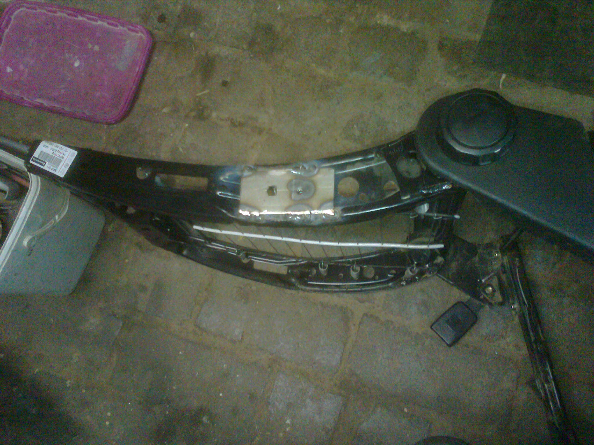 Přišel jsem lacino ;) ke starým loketkám, které měly klasicky ulomený vnější zobáček, takže oprava nutná. Do jedné jsem vložil nový silnější ocelový do drážky, u ostatních jsem vyrobil z válcovaného L úhelníku podložku se zobáčkem a stěnami ohnutými na druhou stranu tak, aby v nich celý odlitek držel. (teď je loketka o 5mm dál od sedačky, ale to snad nebude na závadu)