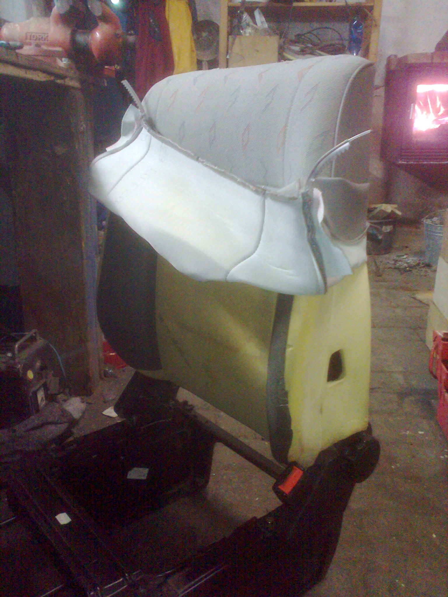 Pěnová výplň opěráku u řidiče byla v místech rámu rozlámaná, po slepení chemoprénem proto dostala ještě z obou stran výztuhu ze zahradnické geotextilie.